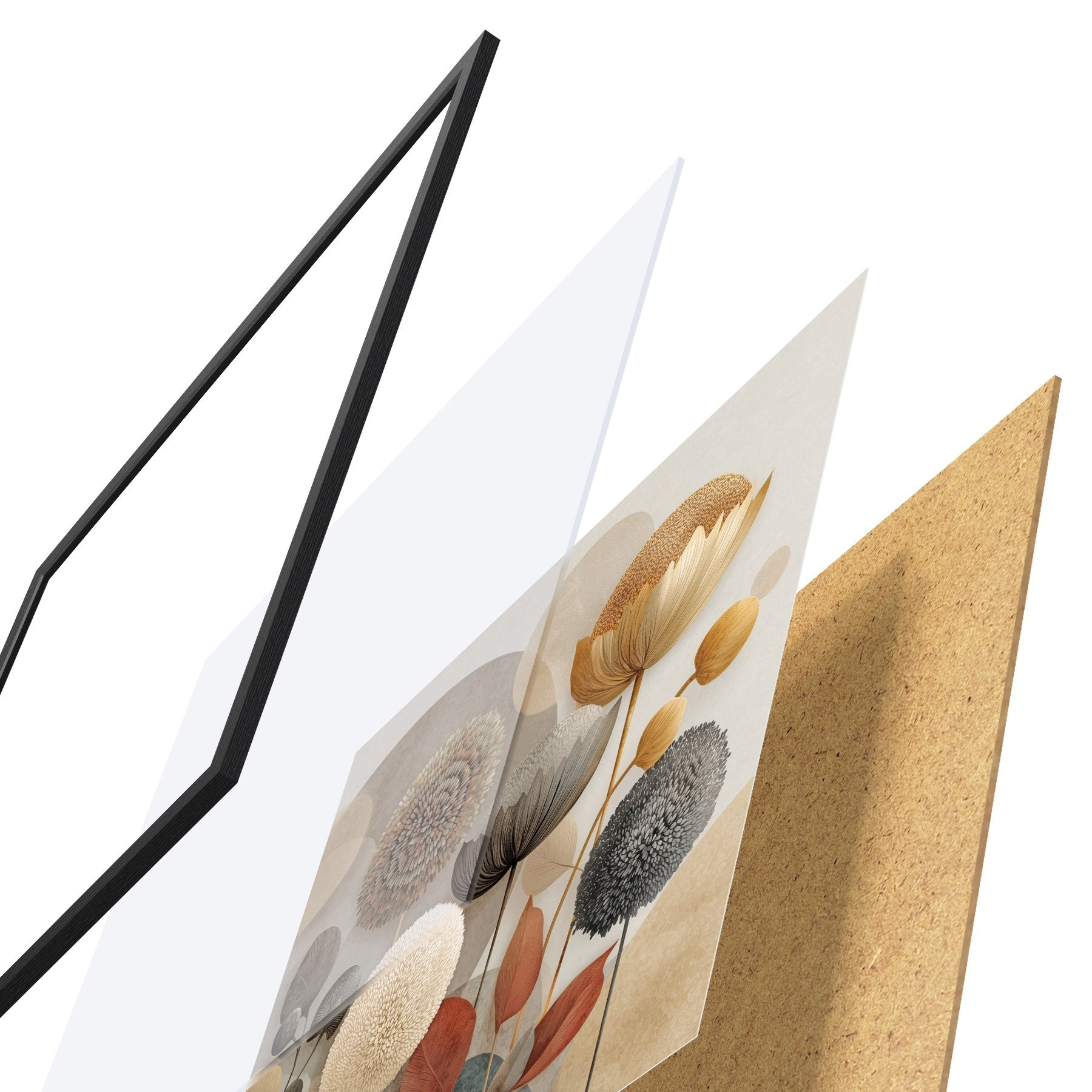 Das Poster besteht aus einem Rahmen, Plexiglas, einem gedruckten Bild und einer Rückwand aus Spanplatten. Dank der Halterungen auf der Rückseite kann das Poster sofort an die Wand gehängt werden.