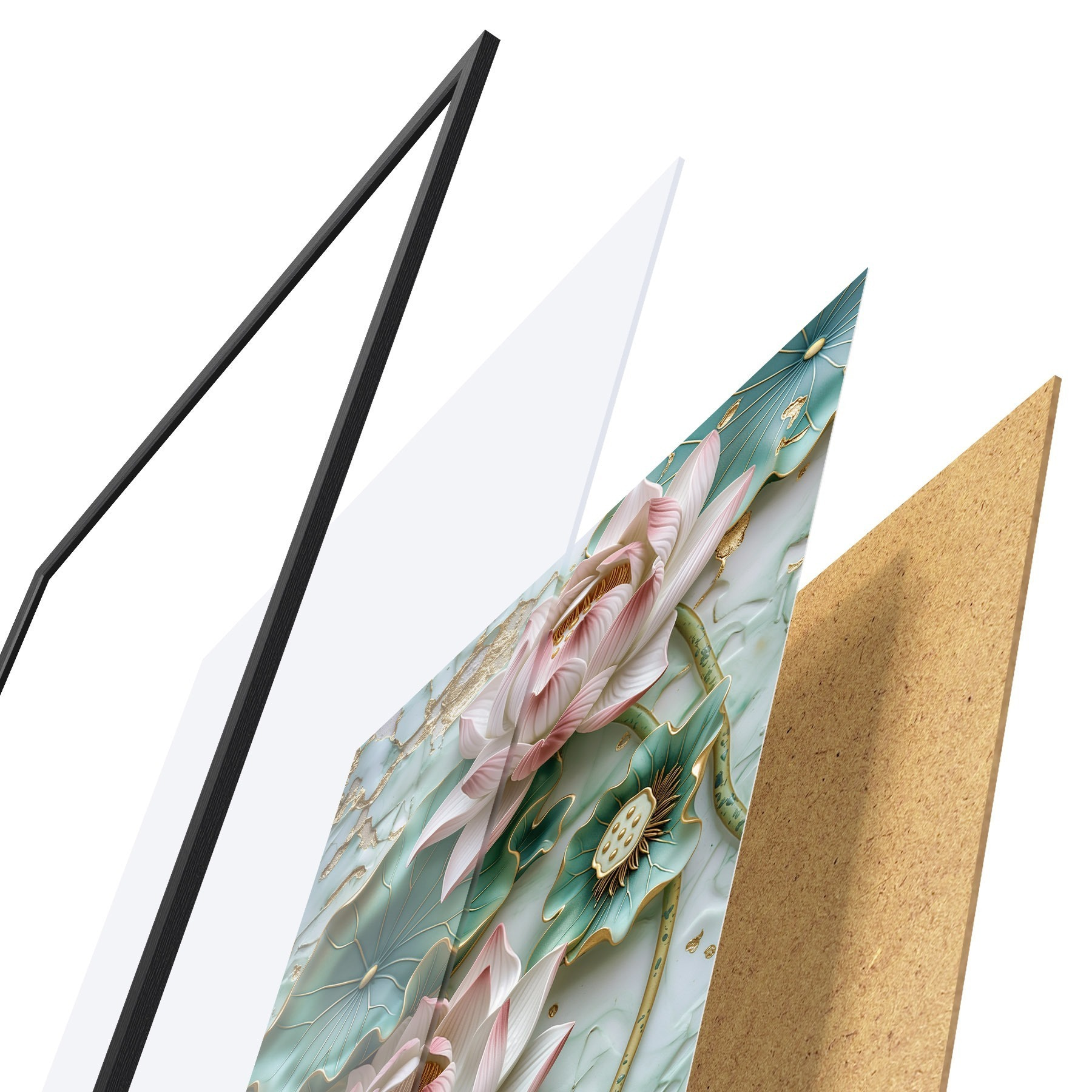 Das Poster besteht aus einem Rahmen, Plexiglas, einem gedruckten Bild und einer Rückwand aus Spanplatten. Dank der Halterungen auf der Rückseite kann das Poster sofort an die Wand gehängt werden.
