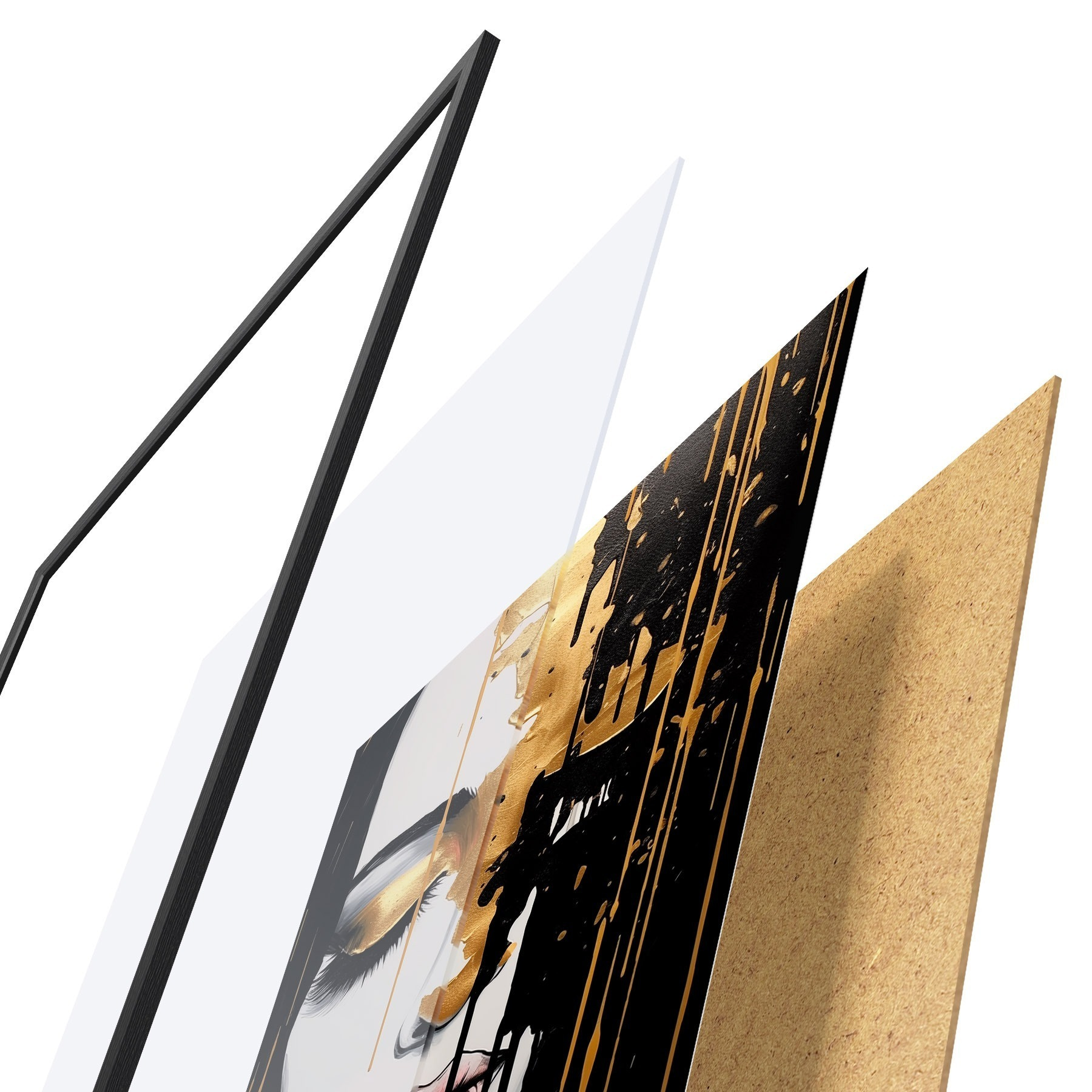 Das Poster besteht aus einem Rahmen, Plexiglas, einem gedruckten Bild und einer Rückwand aus Spanplatten. Dank der Halterungen auf der Rückseite kann das Poster sofort an die Wand gehängt werden.