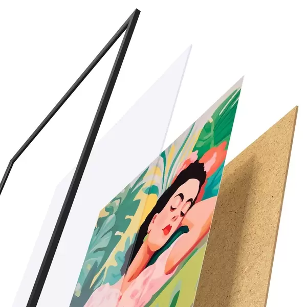 Das Poster besteht aus einem Rahmen, Plexiglas, einem gedruckten Bild und einer Rückwand aus Spanplatten. Dank der Halterungen auf der Rückseite kann das Poster sofort an die Wand gehängt werden.