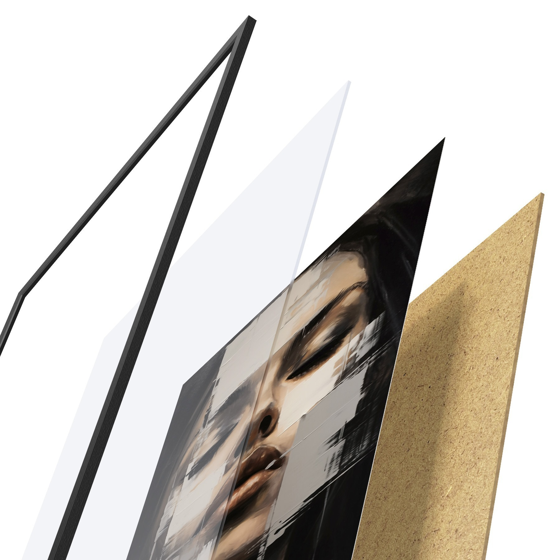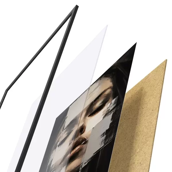 Das Poster besteht aus einem Rahmen, Plexiglas, einem gedruckten Bild und einer Rückwand aus Spanplatten. Dank der Halterungen auf der Rückseite kann das Poster sofort an die Wand gehängt werden.