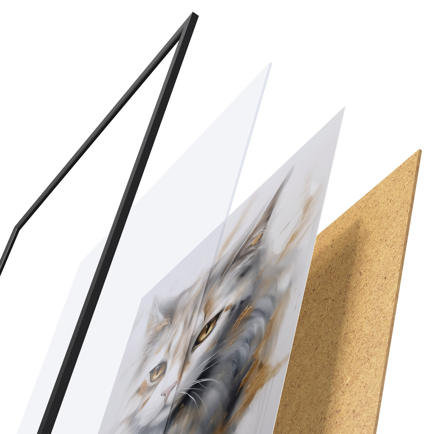 Das Poster besteht aus einem Rahmen, Plexiglas, einem gedruckten Bild und einer Rückwand aus Spanplatten. Dank der Halterungen auf der Rückseite kann das Poster sofort an die Wand gehängt werden.