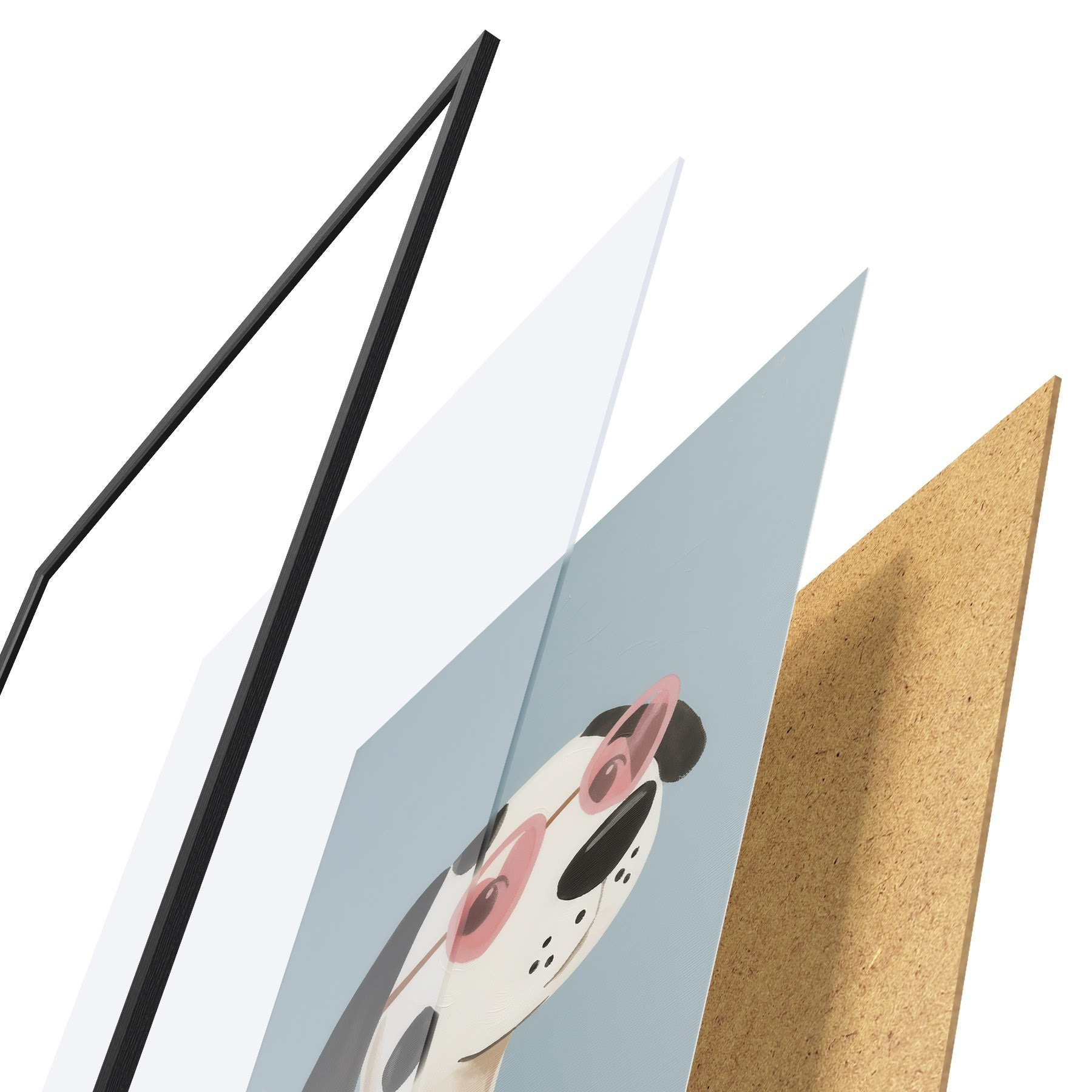 Das Poster besteht aus einem Rahmen, Plexiglas, einem gedruckten Bild und einer Rückwand aus Spanplatten. Dank der Halterungen auf der Rückseite kann das Poster sofort an die Wand gehängt werden.