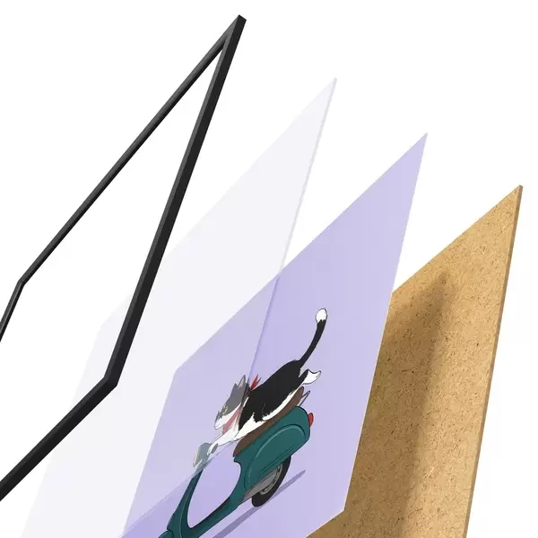 Das Poster besteht aus einem Rahmen, Plexiglas, einem gedruckten Bild und einer Rückwand aus Spanplatten. Dank der Halterungen auf der Rückseite kann das Poster sofort an die Wand gehängt werden.