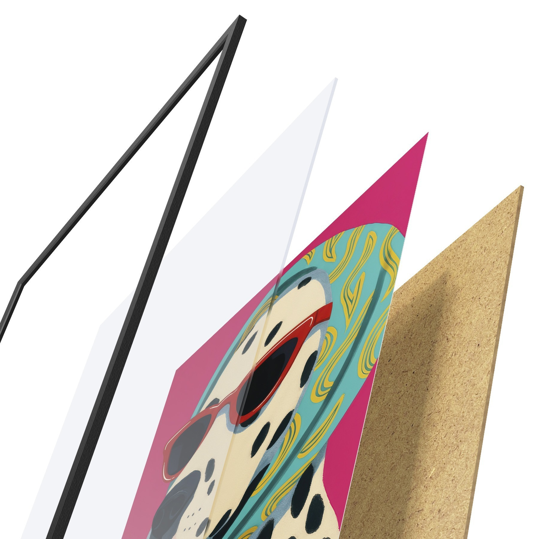 Das Poster besteht aus einem Rahmen, Plexiglas, einem gedruckten Bild und einer Rückwand aus Spanplatten. Dank der Halterungen auf der Rückseite kann das Poster sofort an die Wand gehängt werden.