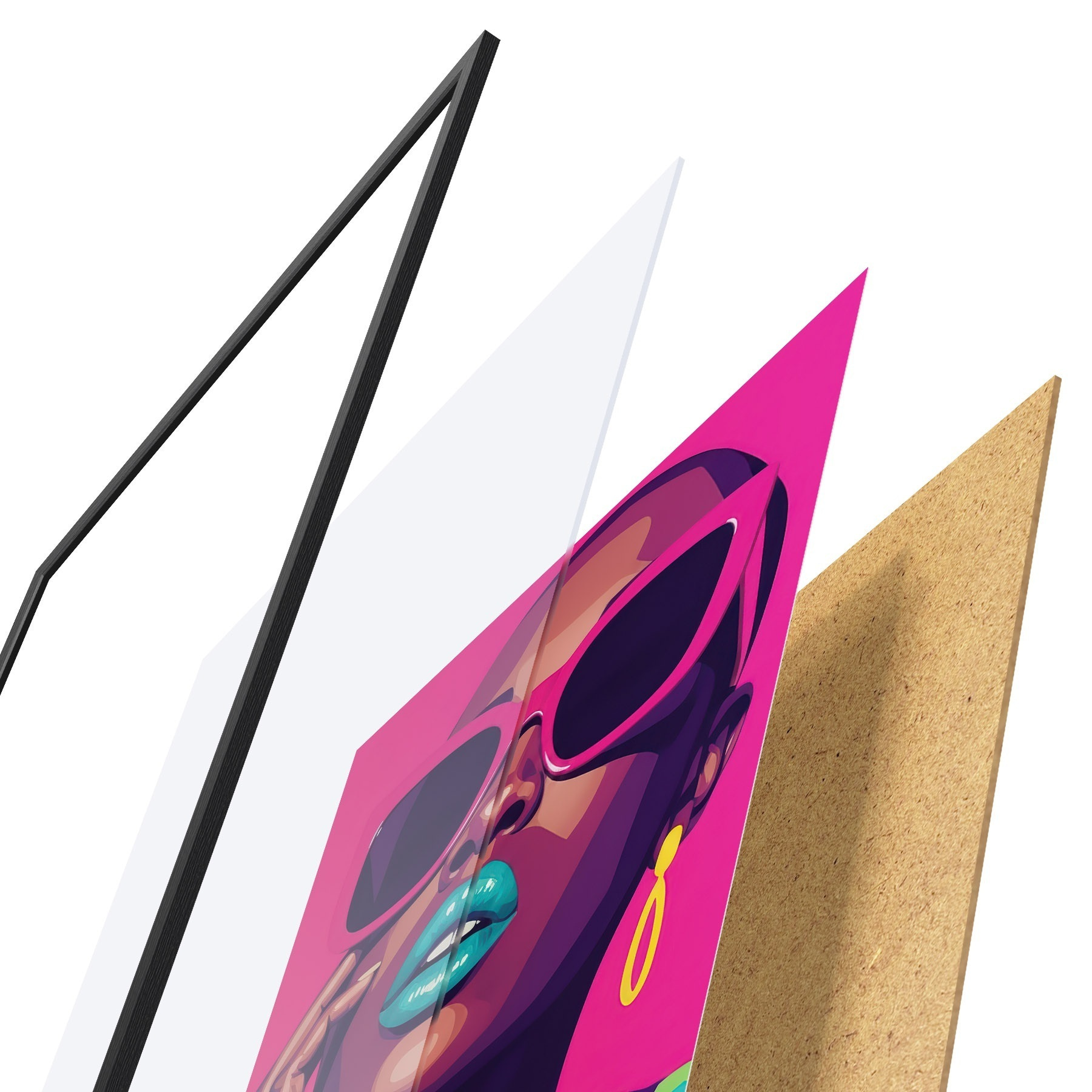 Das Poster besteht aus einem Rahmen, Plexiglas, einem gedruckten Bild und einer Rückwand aus Spanplatten. Dank der Halterungen auf der Rückseite kann das Poster sofort an die Wand gehängt werden.
