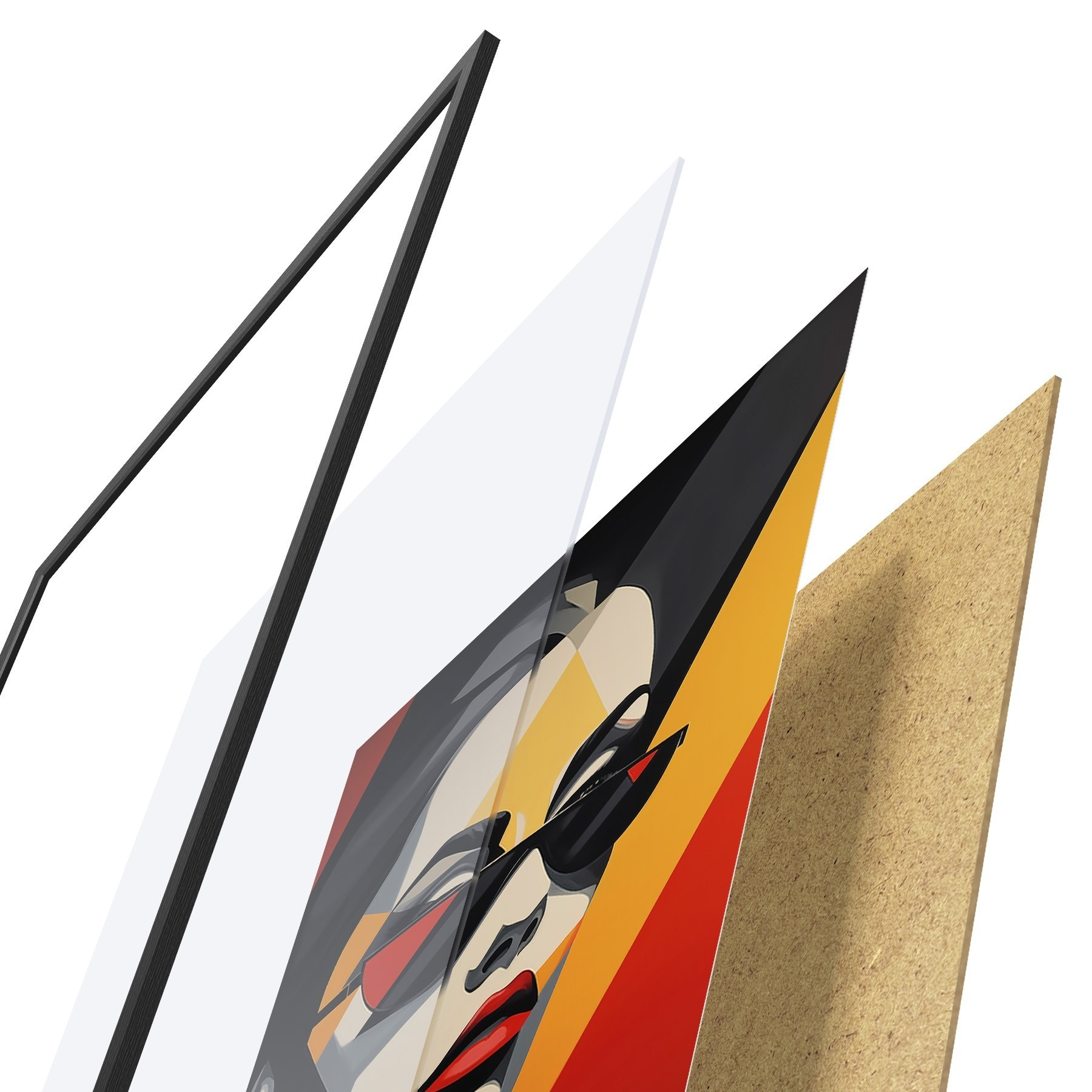 Das Poster besteht aus einem Rahmen, Plexiglas, einem gedruckten Bild und einer Rückwand aus Spanplatten. Dank der Halterungen auf der Rückseite kann das Poster sofort an die Wand gehängt werden.