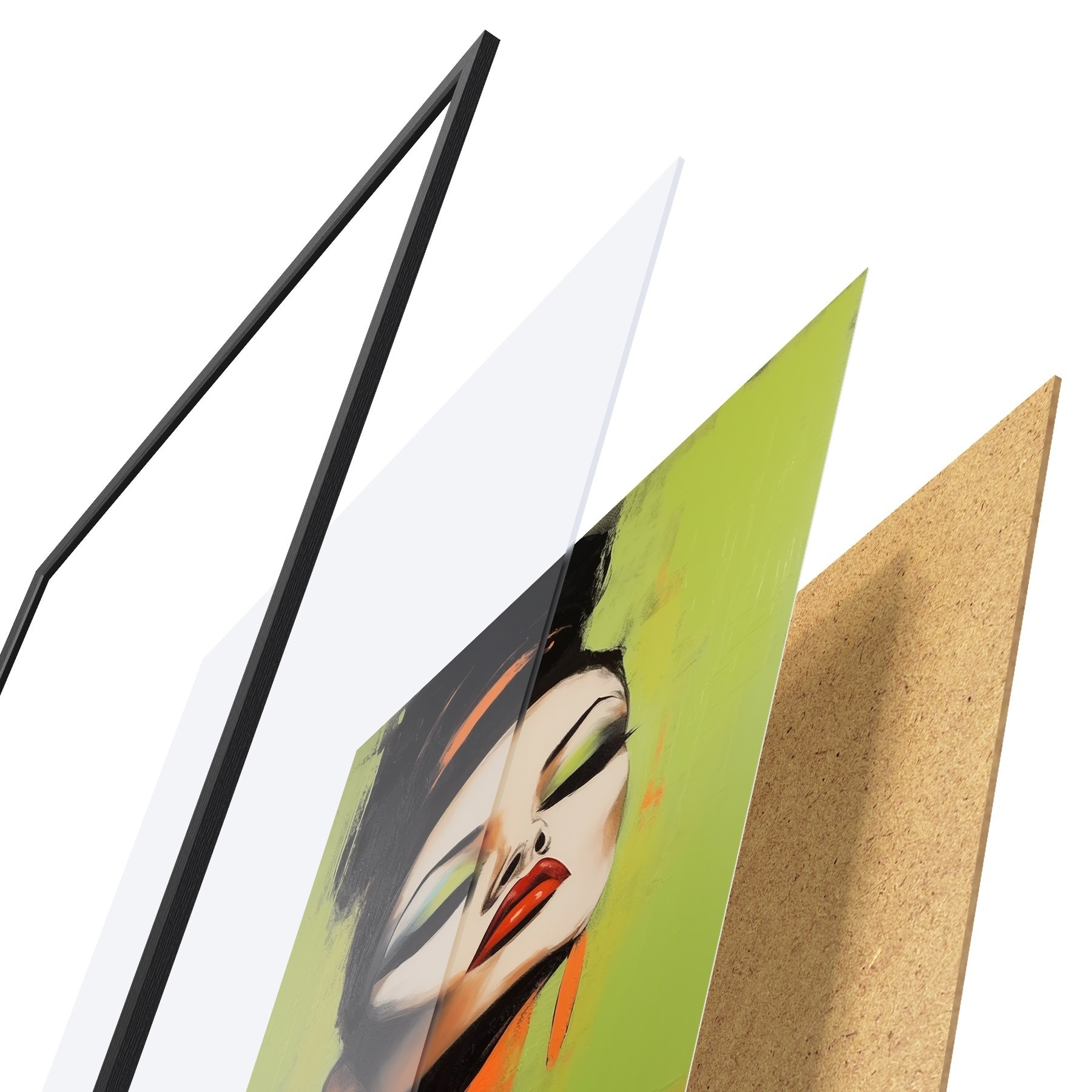Das Poster besteht aus einem Rahmen, Plexiglas, einem gedruckten Bild und einer Rückwand aus Spanplatten. Dank der Halterungen auf der Rückseite kann das Poster sofort an die Wand gehängt werden.