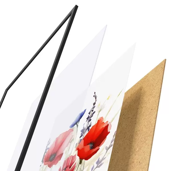 Das Poster besteht aus einem Rahmen, Plexiglas, einem gedruckten Bild und einer Rückwand aus Spanplatten. Dank der Halterungen auf der Rückseite kann das Poster sofort an die Wand gehängt werden.
