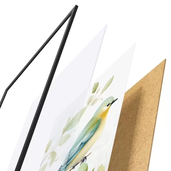 Das Poster besteht aus einem Rahmen, Plexiglas, einem gedruckten Bild und einer Rückwand aus Spanplatten. Dank der Halterungen auf der Rückseite kann das Poster sofort an die Wand gehängt werden.