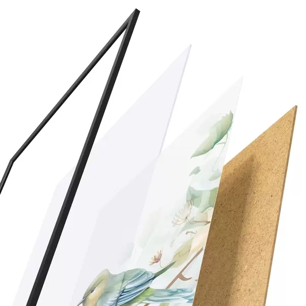 Das Poster besteht aus einem Rahmen, Plexiglas, einem gedruckten Bild und einer Rückwand aus Spanplatten. Dank der Halterungen auf der Rückseite kann das Poster sofort an die Wand gehängt werden.