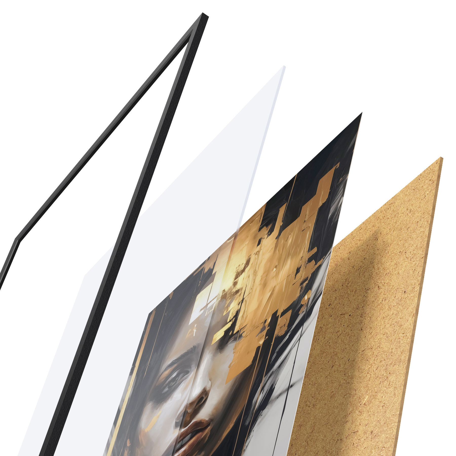 Das Poster besteht aus einem Rahmen, Plexiglas, einem gedruckten Bild und einer Rückwand aus Spanplatten. Dank der Halterungen auf der Rückseite kann das Poster sofort an die Wand gehängt werden.