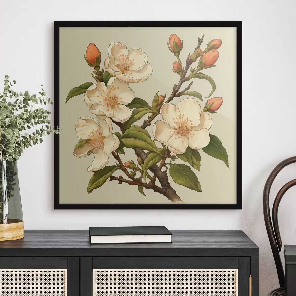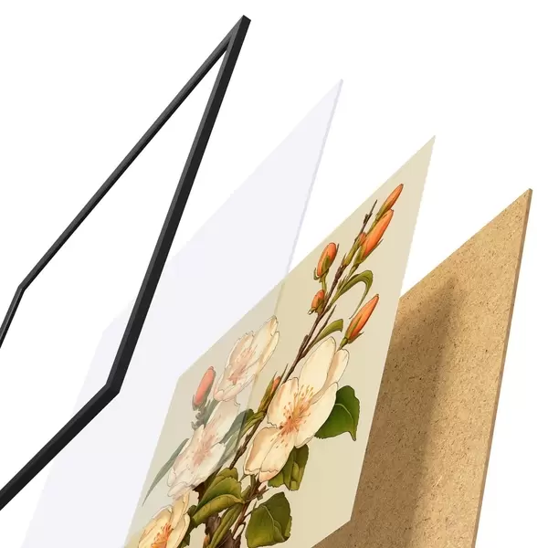 Poster Blühender Zweig mit weißen Blüten auf beigem Hintergrund im Stil einer klassischen Illustration Nr f46923
