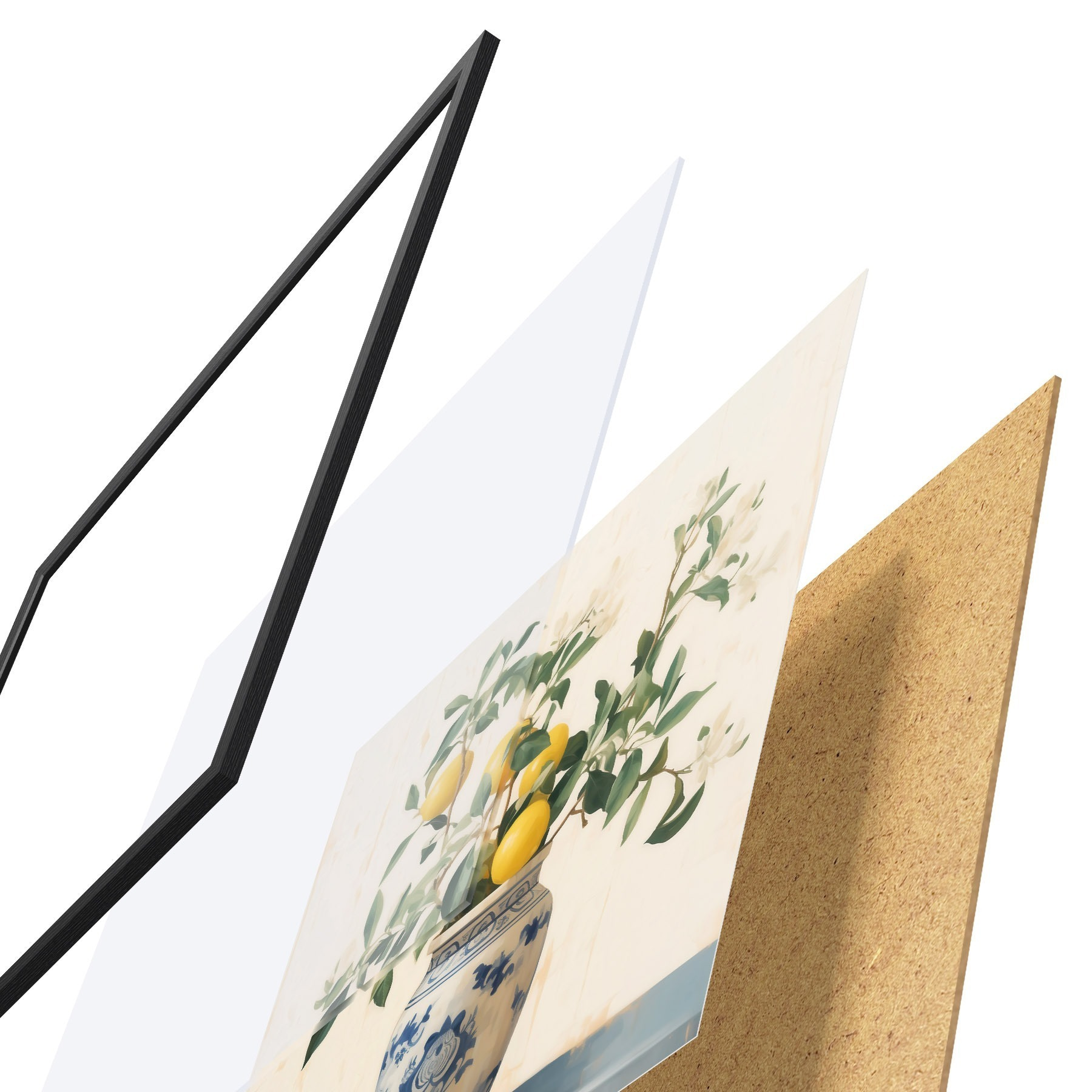 Das Poster besteht aus einem Rahmen, Plexiglas, einem gedruckten Bild und einer Rückwand aus Spanplatten. Dank der Halterungen auf der Rückseite kann das Poster sofort an die Wand gehängt werden.