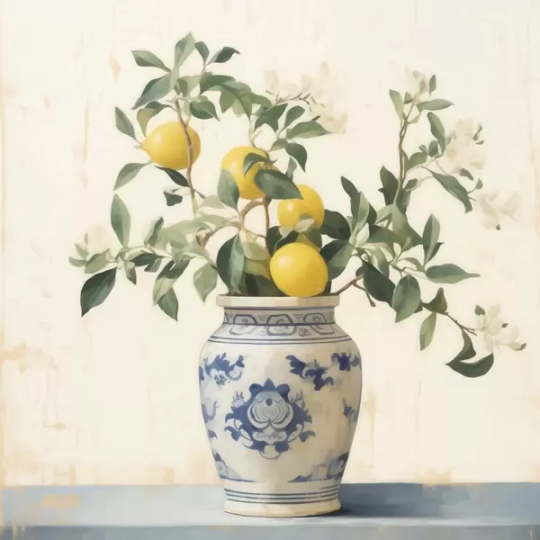 Poster Zitronen in einer blau-weißen Keramikvase im Stil eines Ölgemäldes Nr f46924