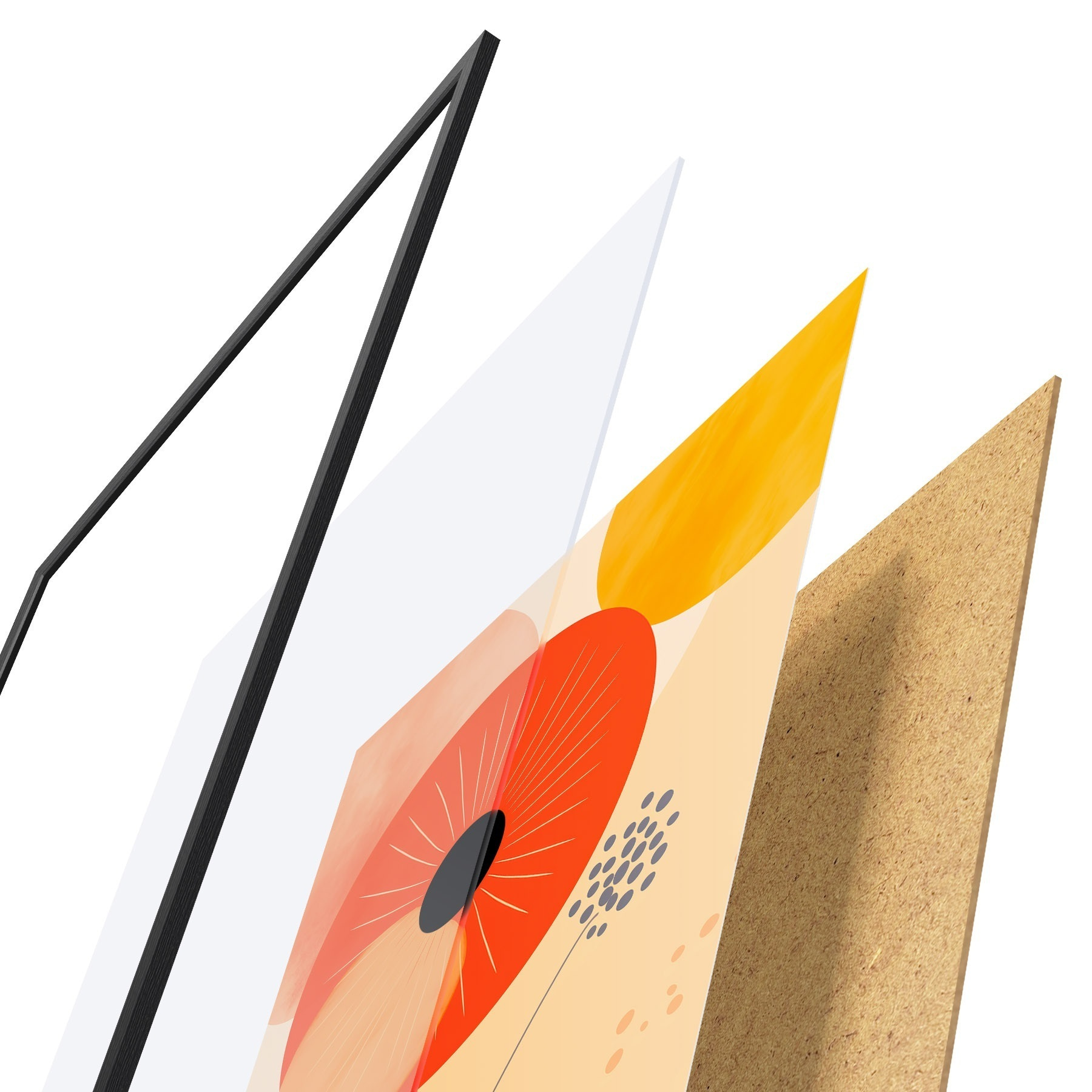 Das Poster besteht aus einem Rahmen, Plexiglas, einem gedruckten Bild und einer Rückwand aus Spanplatten. Dank der Halterungen auf der Rückseite kann das Poster sofort an die Wand gehängt werden.