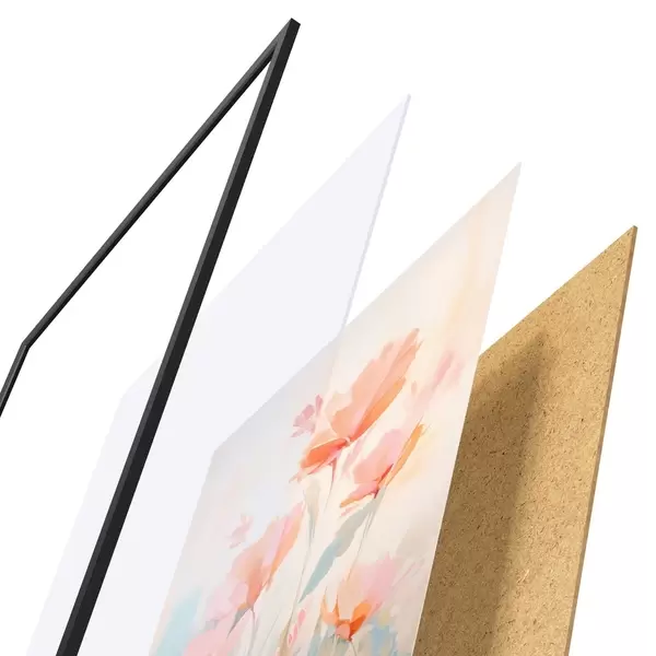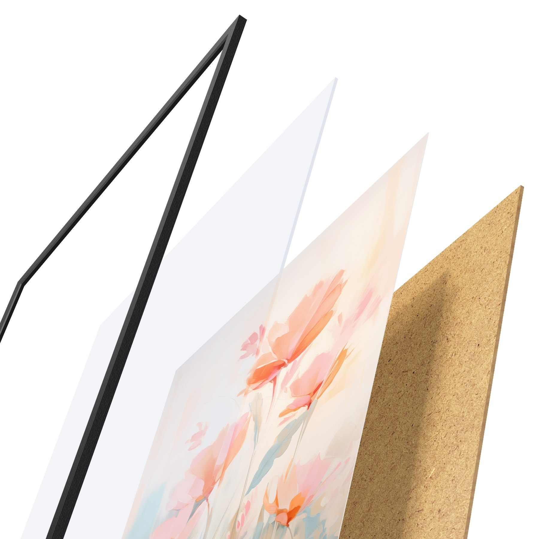 Das Poster besteht aus einem Rahmen, Plexiglas, einem gedruckten Bild und einer Rückwand aus Spanplatten. Dank der Halterungen auf der Rückseite kann das Poster sofort an die Wand gehängt werden.