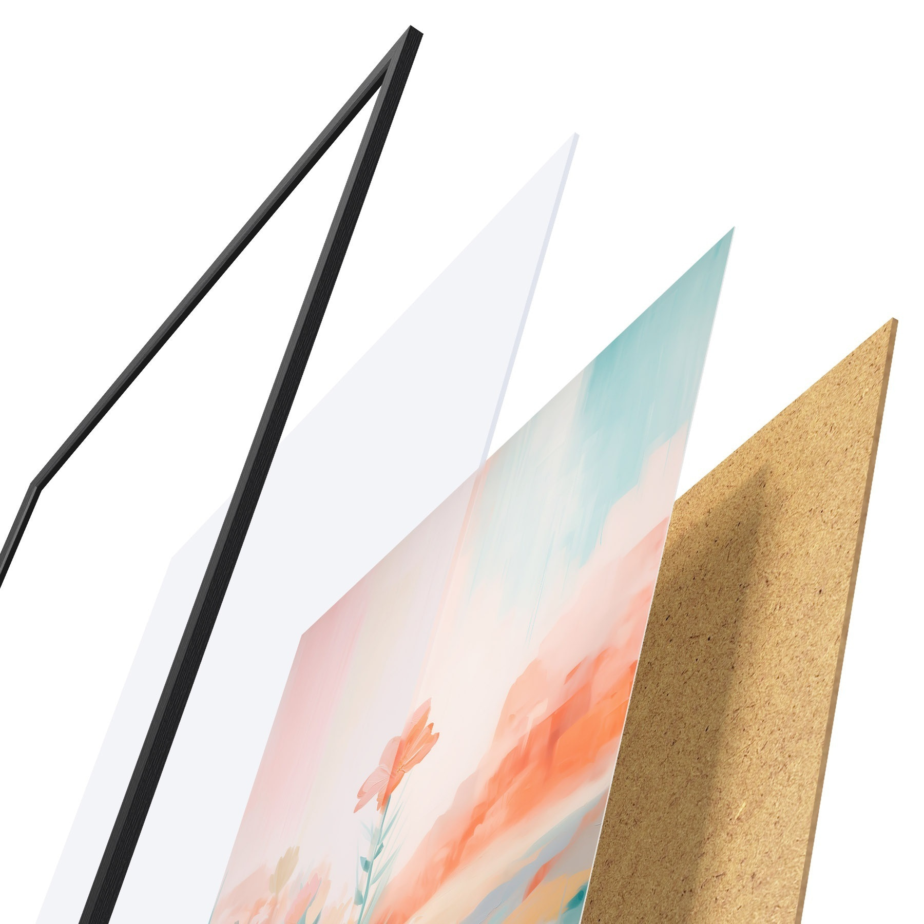 Das Poster besteht aus einem Rahmen, Plexiglas, einem gedruckten Bild und einer Rückwand aus Spanplatten. Dank der Halterungen auf der Rückseite kann das Poster sofort an die Wand gehängt werden.