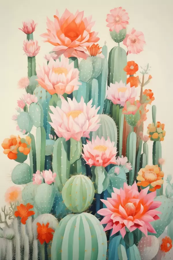 Poster Blühende Kakteen mit rosa und orangefarbenen Blüten im Illustrationsstil Nr f46934