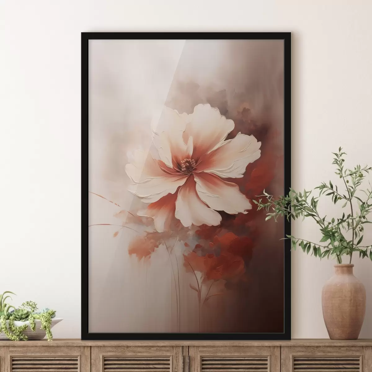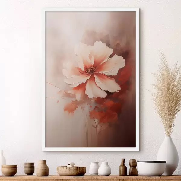 Poster Zarte weiße Korallenblume vor einem verschwommenen Hintergrund im Stil eines Ölgemäldes f46938