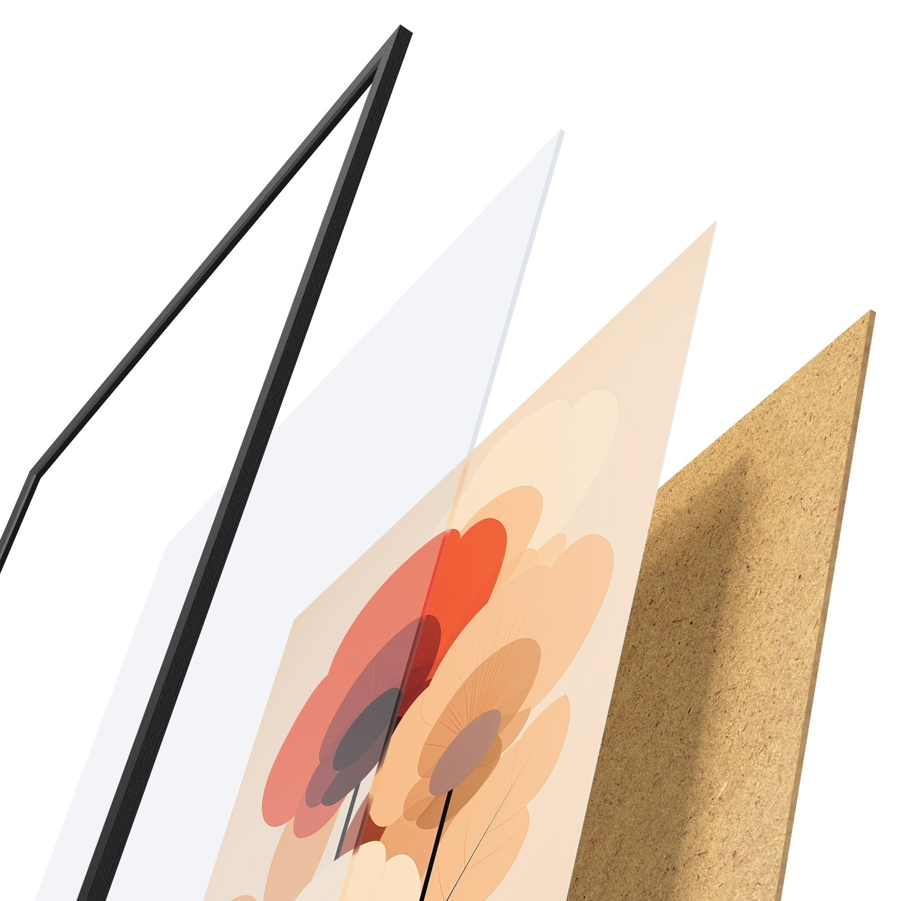 Das Poster besteht aus einem Rahmen, Plexiglas, einem gedruckten Bild und einer Rückwand aus Spanplatten. Dank der Halterungen auf der Rückseite kann das Poster sofort an die Wand gehängt werden.