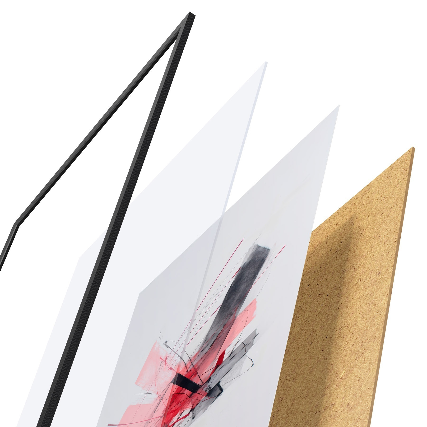Das Poster besteht aus einem Rahmen, Plexiglas, einem gedruckten Bild und einer Rückwand aus Spanplatten. Dank der Halterungen auf der Rückseite kann das Poster sofort an die Wand gehängt werden.