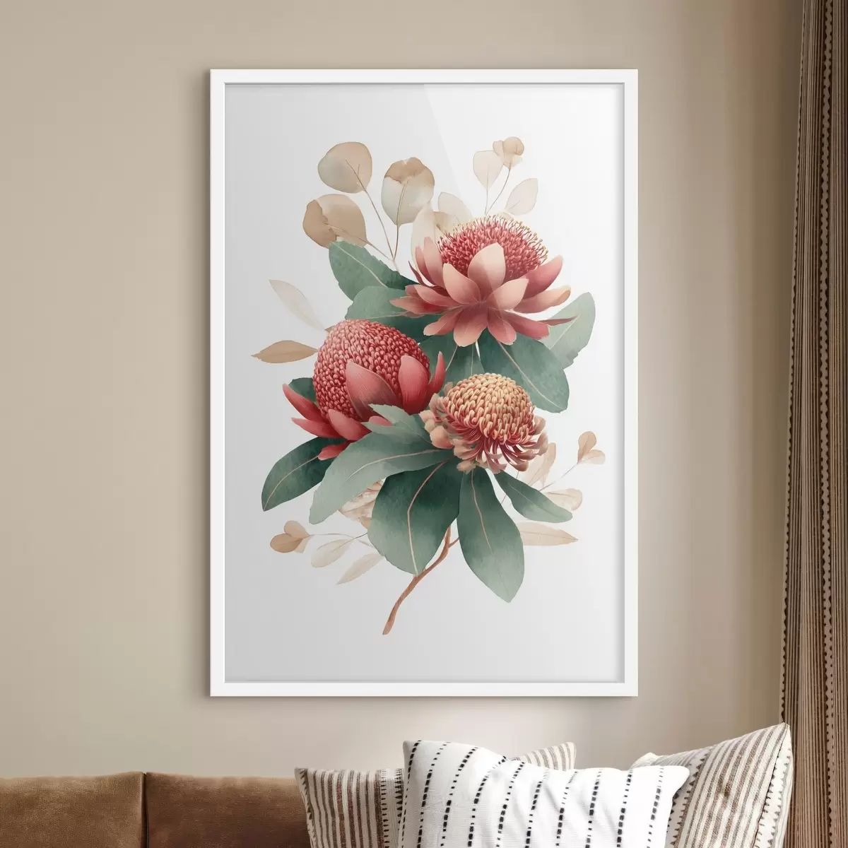 Poster Blumenkomposition mit großen Proteas und Eukalyptus im modernen Stil digitaler Malerei Nr f46955