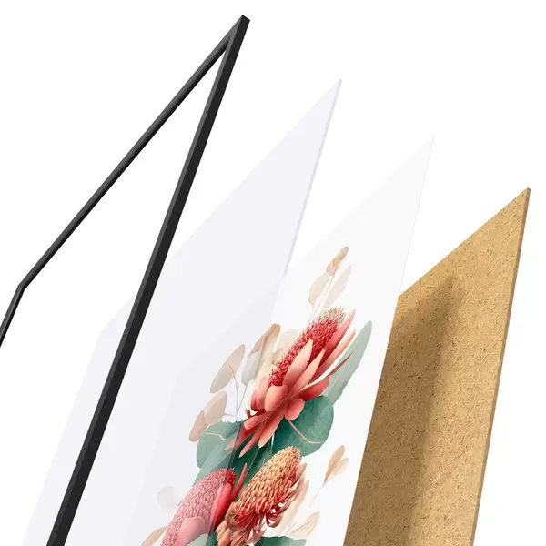 Das Poster besteht aus einem Rahmen, Plexiglas, einem gedruckten Bild und einer Rückwand aus Spanplatten. Dank der Halterungen auf der Rückseite kann das Poster sofort an die Wand gehängt werden.
