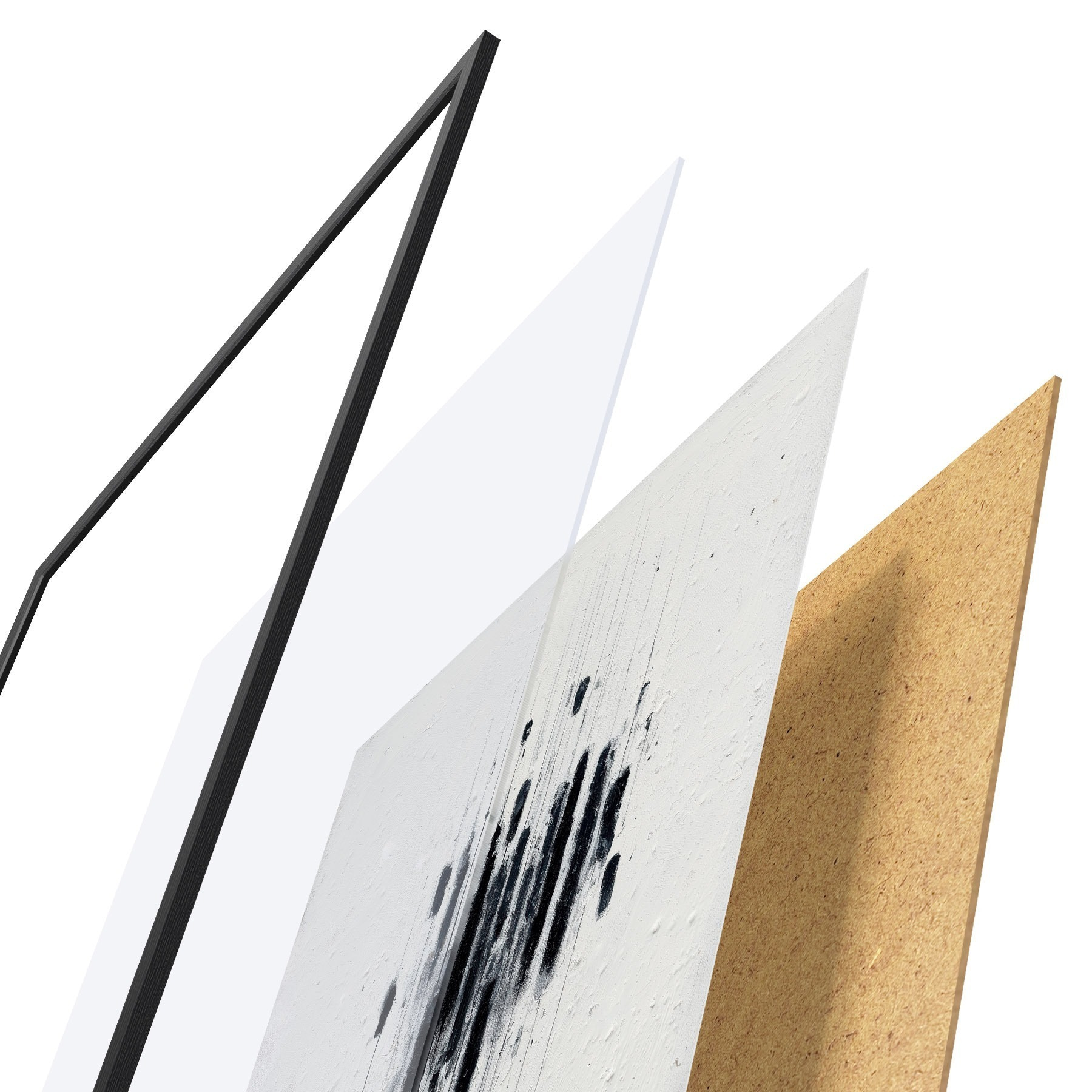 Das Poster besteht aus einem Rahmen, Plexiglas, einem gedruckten Bild und einer Rückwand aus Spanplatten. Dank der Halterungen auf der Rückseite kann das Poster sofort an die Wand gehängt werden.