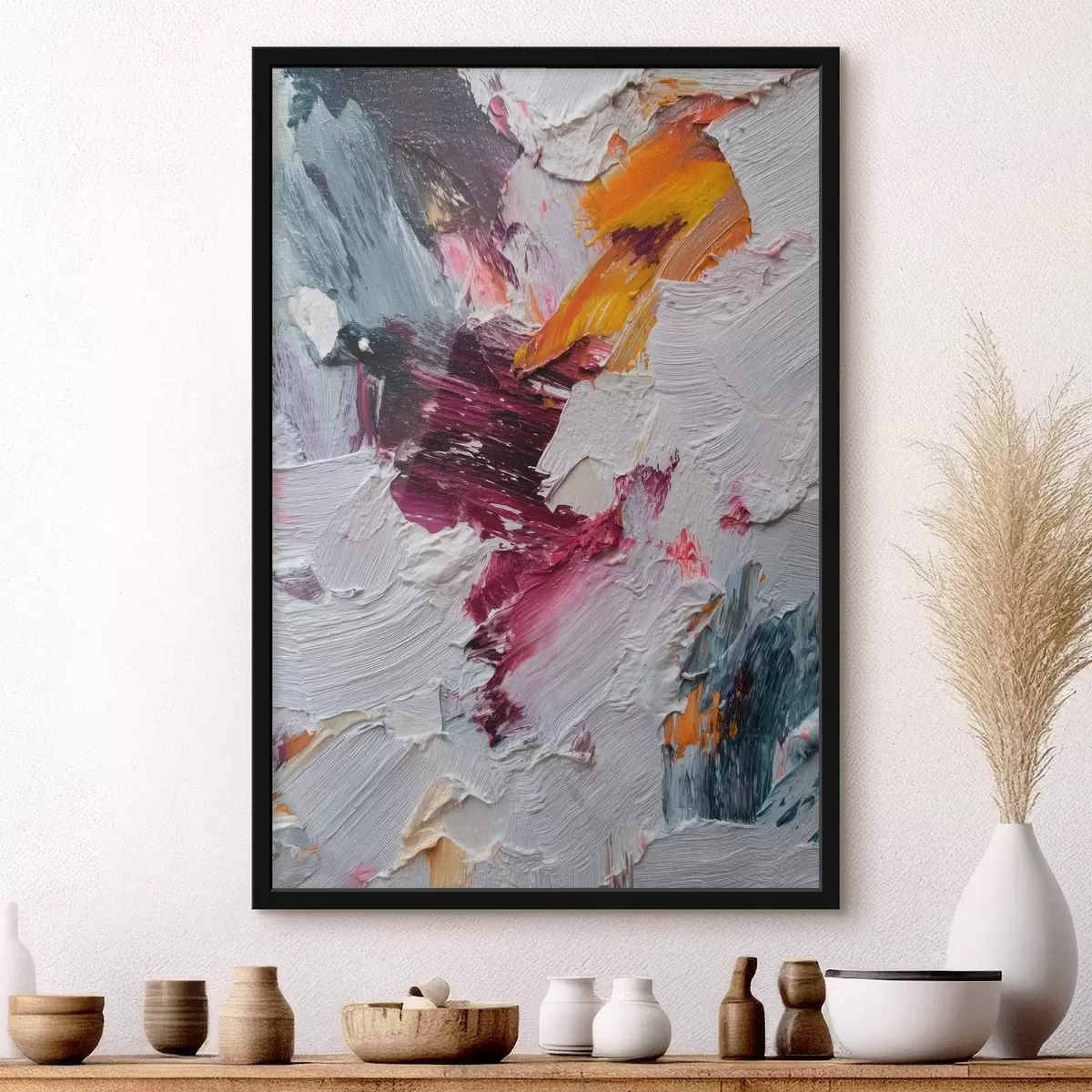 Poster Abstrakte Komposition mit intensiven Pinselstrichen in Kirsch- und Orangetönen im Stil der Ölmalerei Nr f46959