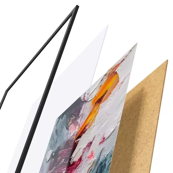 Das Poster besteht aus einem Rahmen, Plexiglas, einem gedruckten Bild und einer Rückwand aus Spanplatten. Dank der Halterungen auf der Rückseite kann das Poster sofort an die Wand gehängt werden.