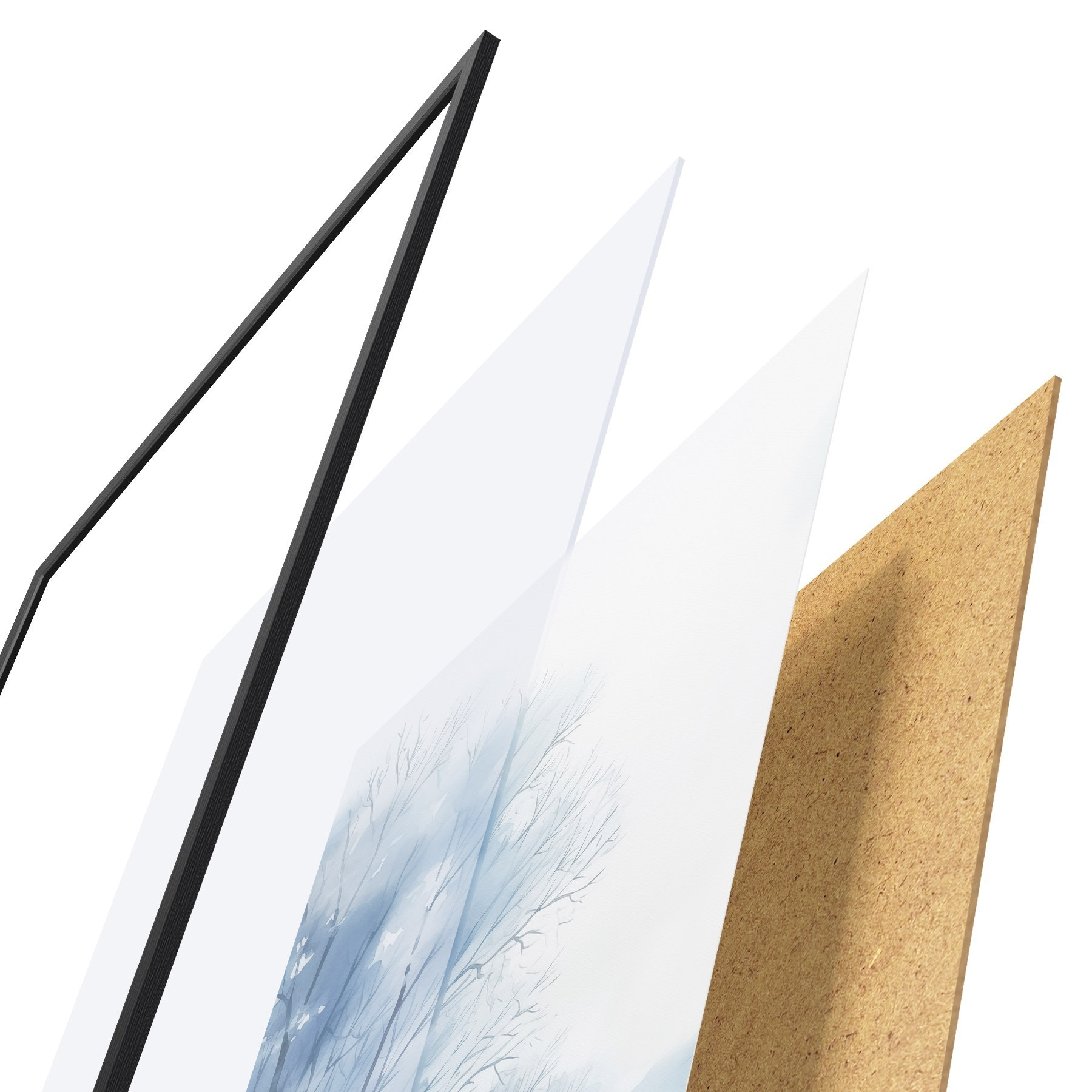 Das Poster besteht aus einem Rahmen, Plexiglas, einem gedruckten Bild und einer Rückwand aus Spanplatten. Dank der Halterungen auf der Rückseite kann das Poster sofort an die Wand gehängt werden.