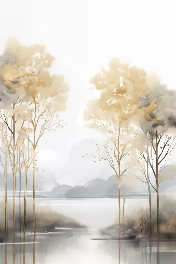 Poster Dekorative abstrakte Landschaft, hohe Bäume mit gelben Blättern, ein Fluss und Nebel im Hintergrund Nr f47015
