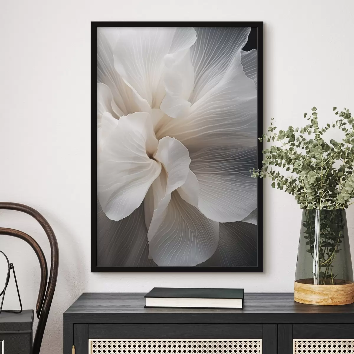 Poster Nahaufnahme von zarten, abstrakten weißen Blütenblättern mit filigranen Linien und einem verschwommenen dunklen Hintergrund f47018