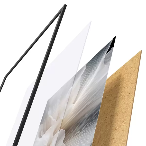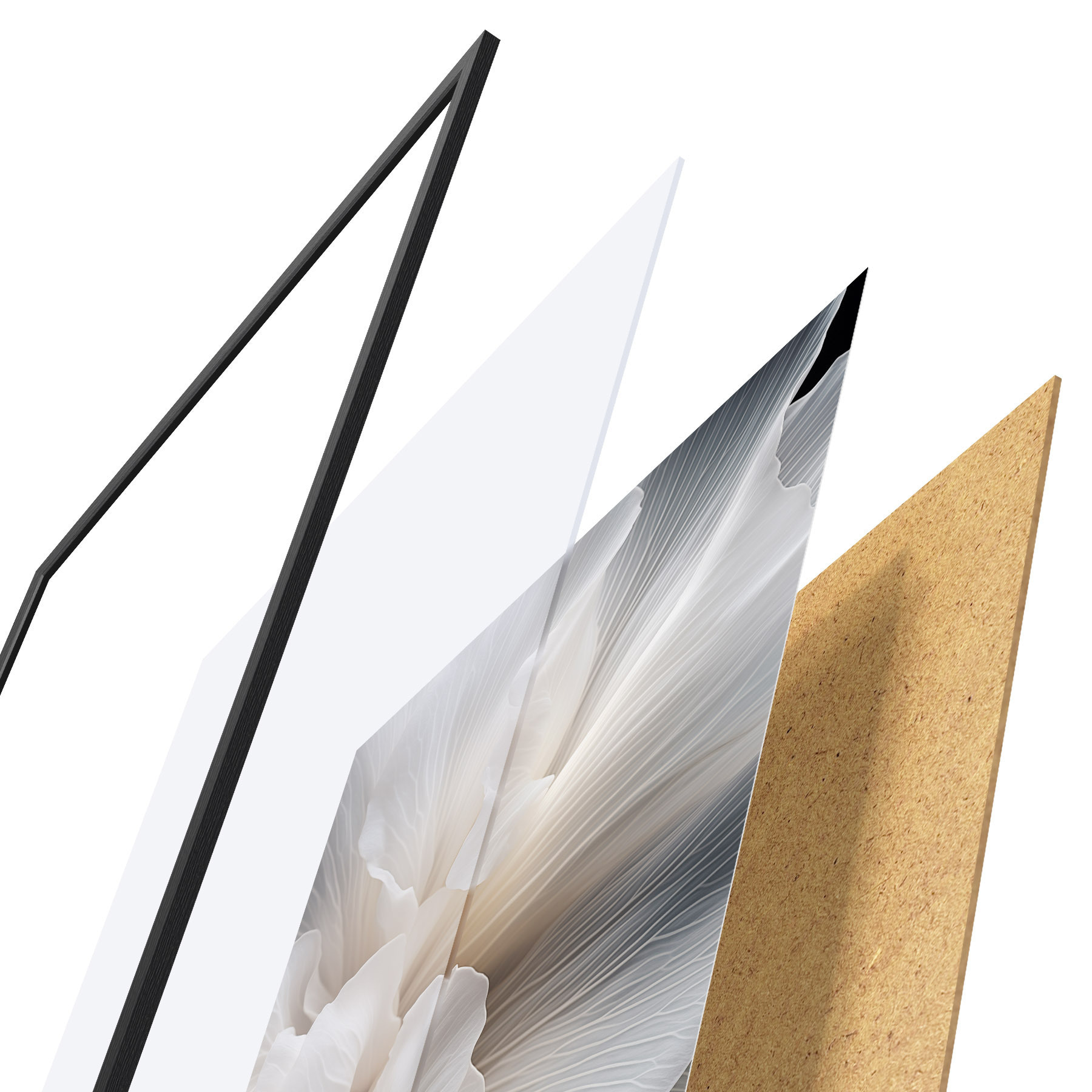 Das Poster besteht aus einem Rahmen, Plexiglas, einem gedruckten Bild und einer Rückwand aus Spanplatten. Dank der Halterungen auf der Rückseite kann das Poster sofort an die Wand gehängt werden.