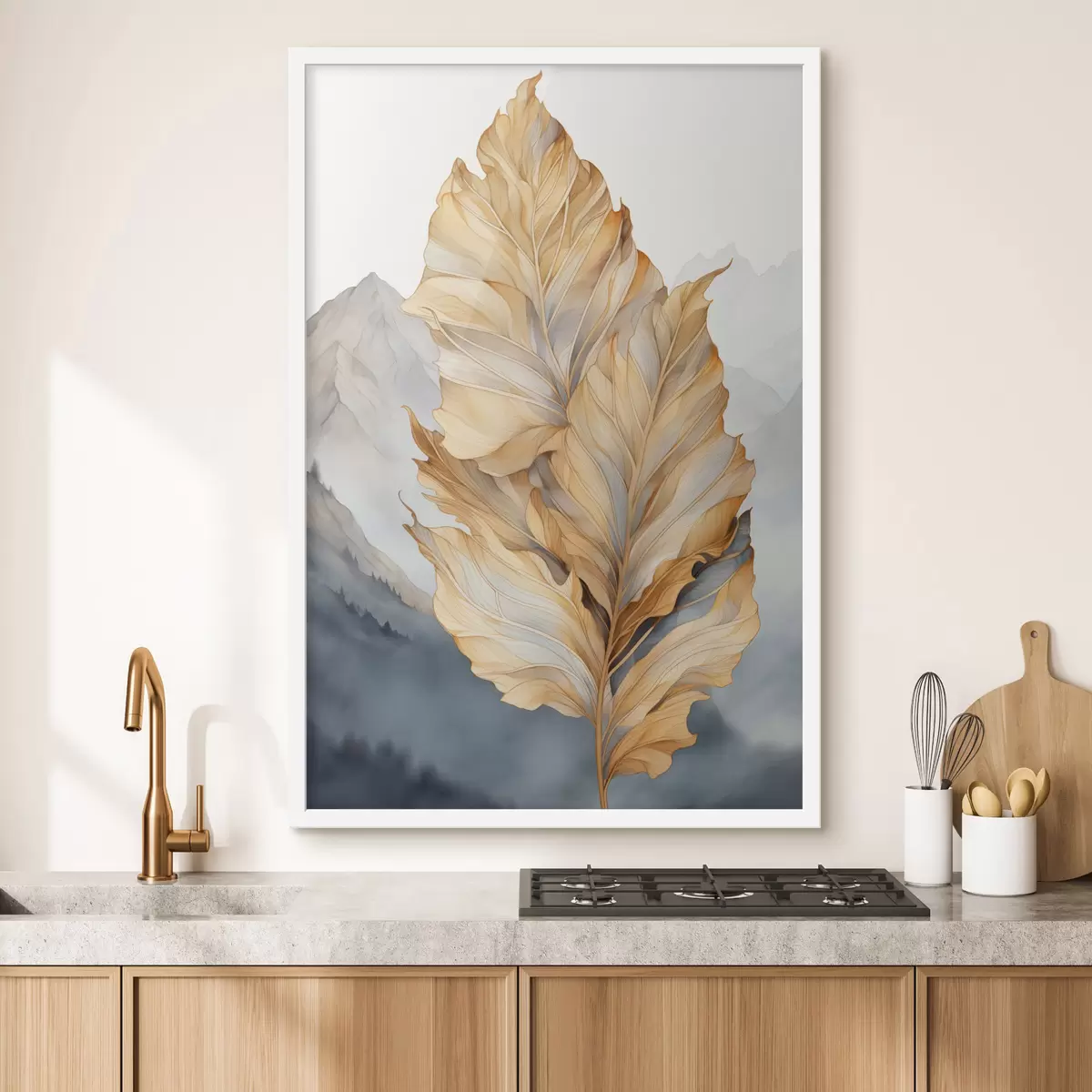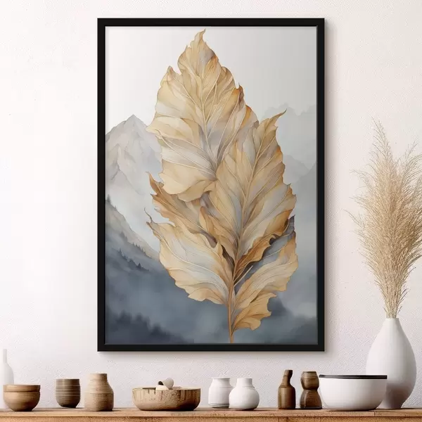 Poster Abstrakte große, gelbe und braune Blätter mit komplexen Details vor einer Berglandschaft Nr f47022