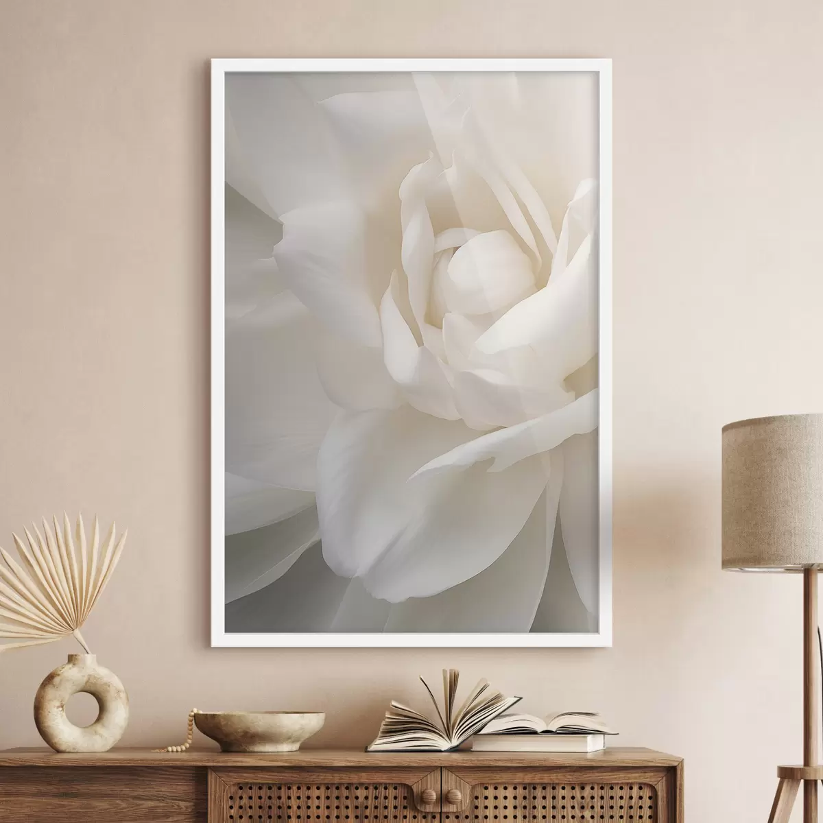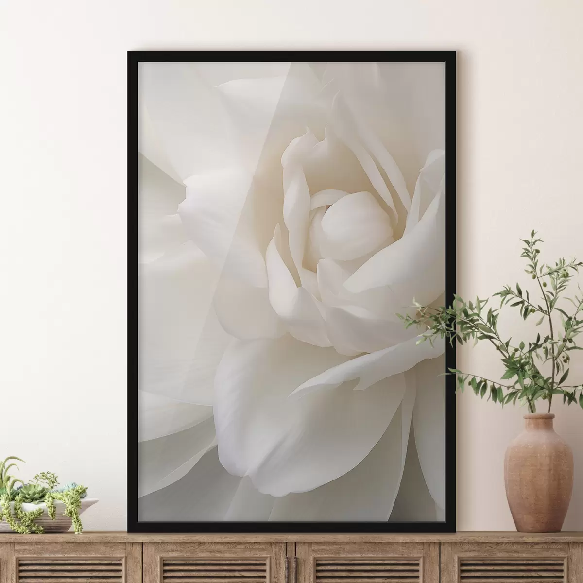 Poster Abstrakte weiße Blume mit zarten, geschichteten Blütenblättern, minimalistische Kunst f47025