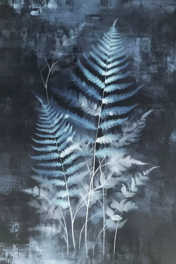 Poster Blaue Farne und Pflanzen vor einem dunklen, strukturierten Hintergrund, mit Fokus auf den komplexen Details, Röntgeneffekt f47026
