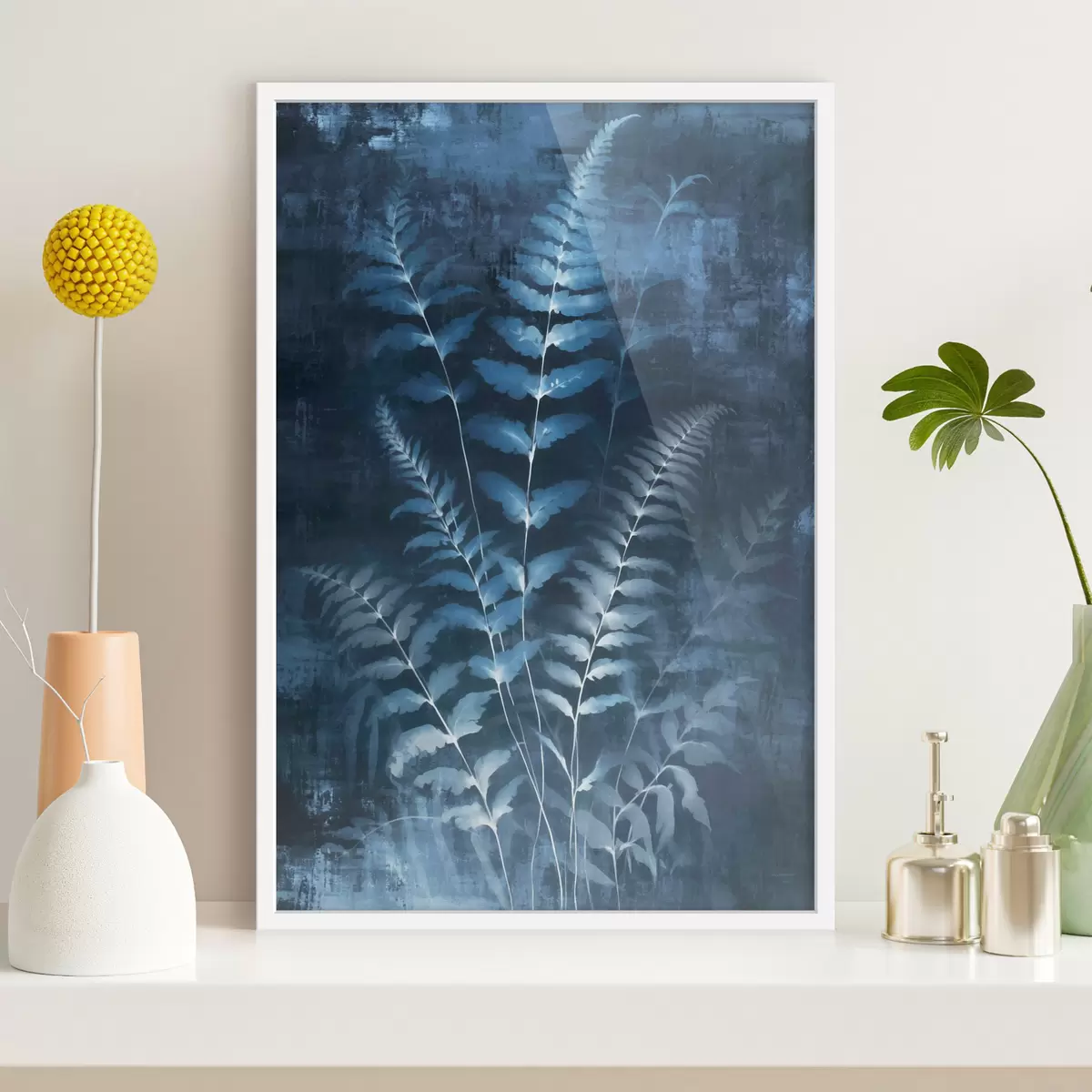 Poster Blaue Farne und Pflanzen vor einem dunklen, strukturierten Hintergrund, mit Fokus auf den komplexen Details, Röntgeneffekt f47027