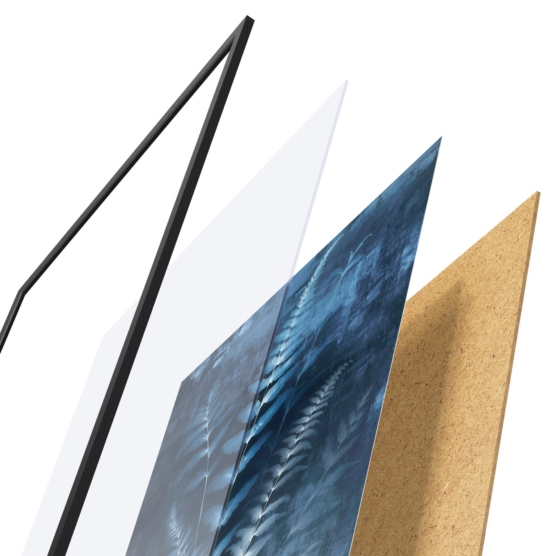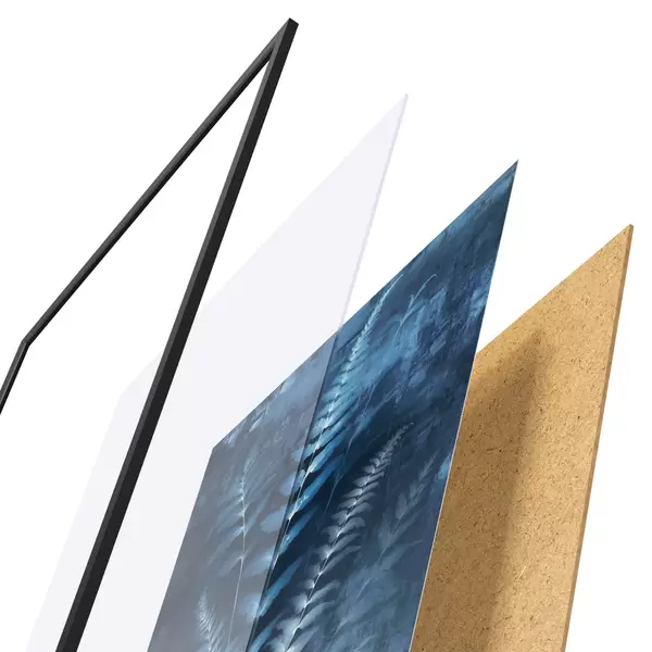 Das Poster besteht aus einem Rahmen, Plexiglas, einem gedruckten Bild und einer Rückwand aus Spanplatten. Dank der Halterungen auf der Rückseite kann das Poster sofort an die Wand gehängt werden.