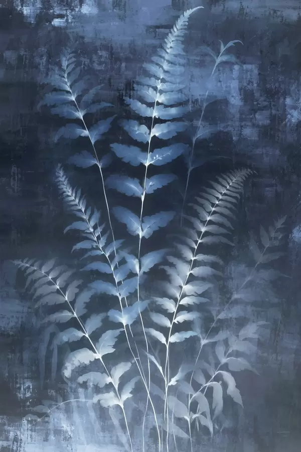 Poster Blaue Farne und Pflanzen vor einem dunklen, strukturierten Hintergrund, mit Fokus auf den komplexen Details, Röntgeneffekt f47027
