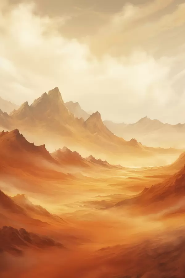 Poster Eine weite, orangefarbene Wüstenlandschaft mit hoch aufragenden, felsigen Bergen unter einem dunstigen, sonnenbeschienenen Himmel mit dünnen Wolken Nr f47029