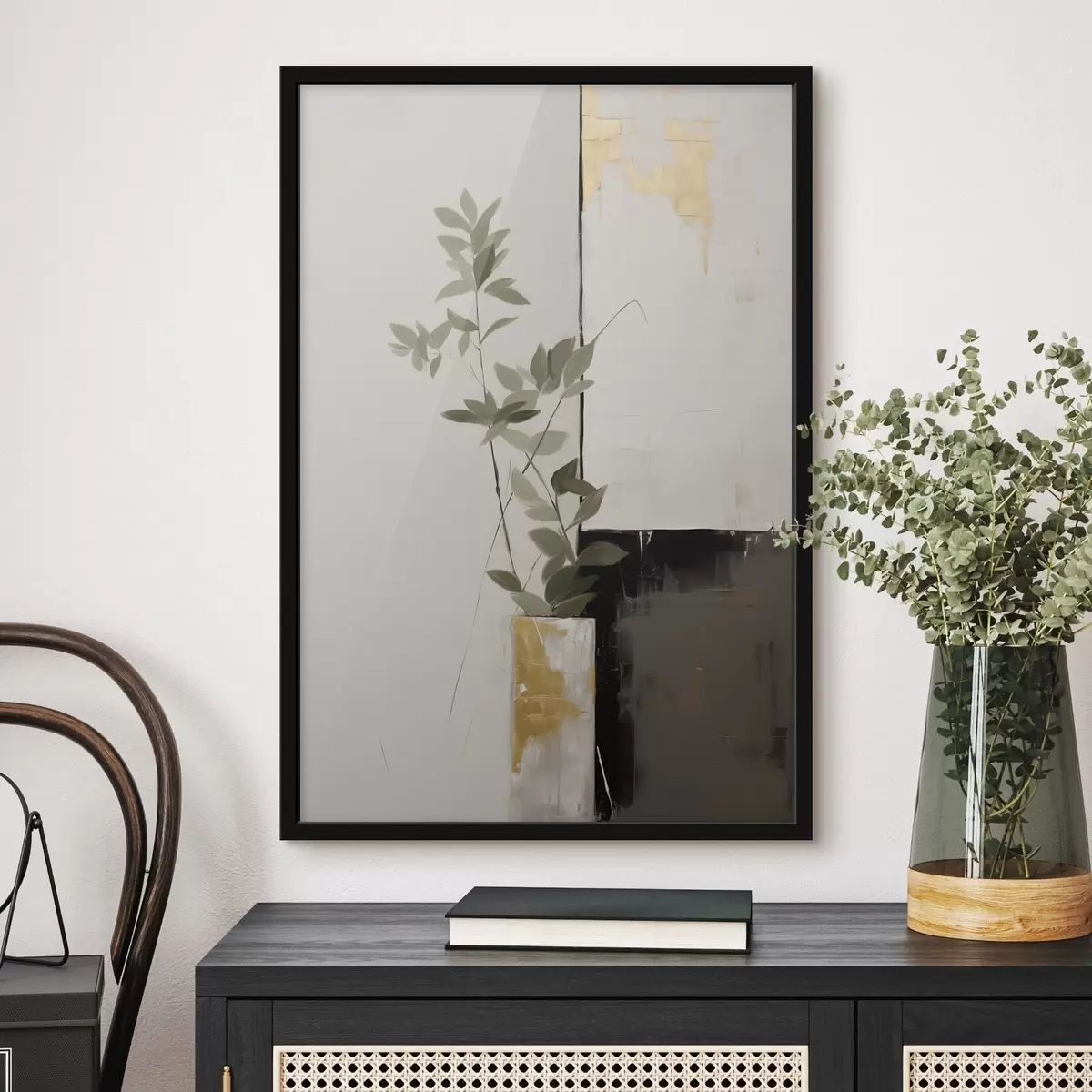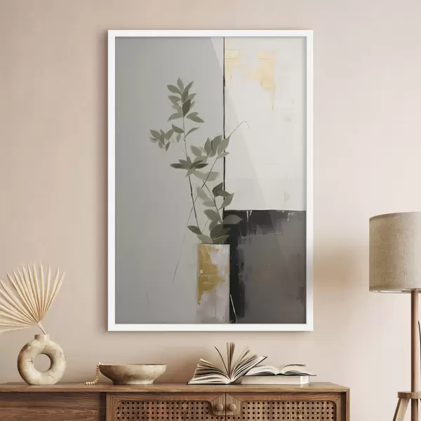 Poster Ein minimalistisches, strukturiertes Gemälde einer Vase mit grünen Blättern vor einem Hintergrund aus abstrakten geometrischen Formen. Nr f47036