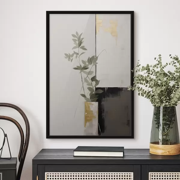Poster Ein minimalistisches, strukturiertes Gemälde einer Vase mit grünen Blättern vor einem Hintergrund aus abstrakten geometrischen Formen. f47036