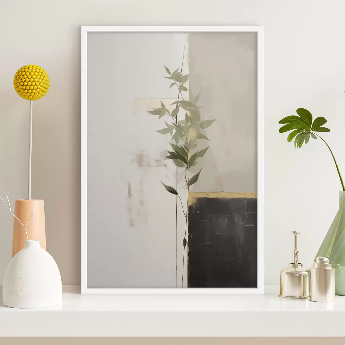 Poster Ein minimalistisches, strukturiertes Gemälde einer Vase mit grünen Blättern vor einem Hintergrund aus abstrakten geometrischen Formen. Nr f47037