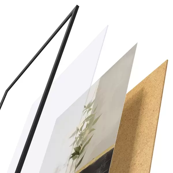 Das Poster besteht aus einem Rahmen, Plexiglas, einem gedruckten Bild und einer Rückwand aus Spanplatten. Dank der Halterungen auf der Rückseite kann das Poster sofort an die Wand gehängt werden.