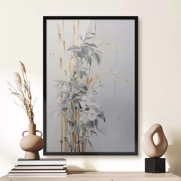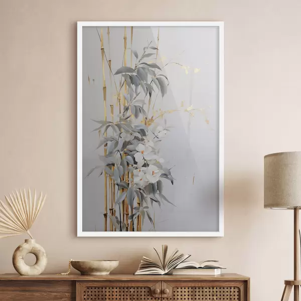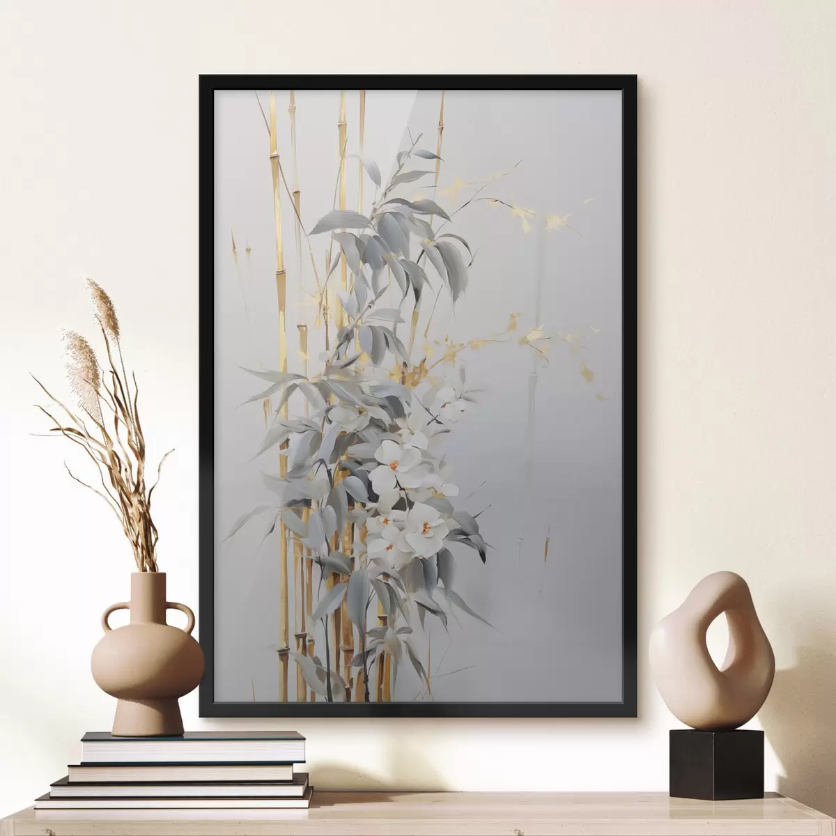 Poster Abstrakte Bambusstämme mit gelben Akzenten, zarten weißen Blüten und hellgrünen Blättern, grauer Hintergrund f47038