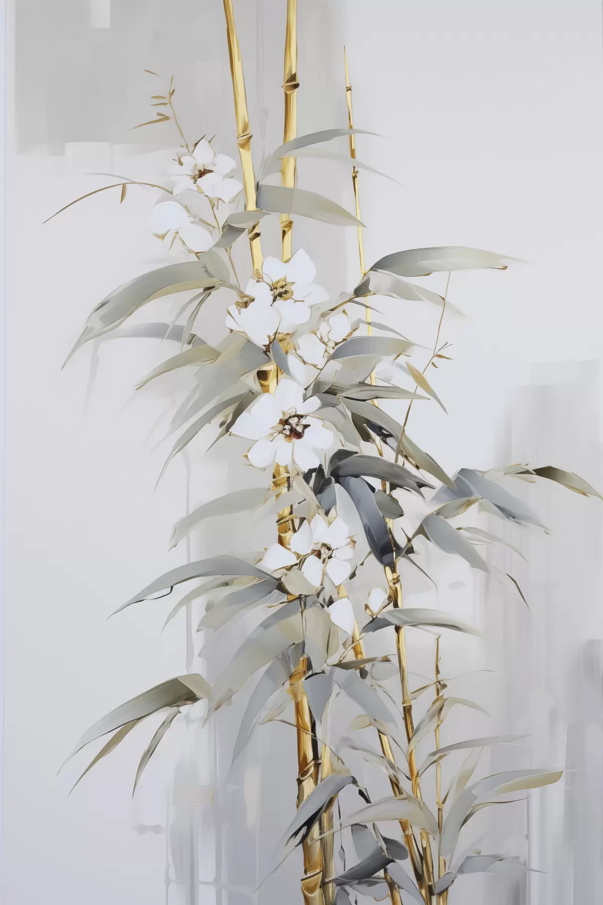Poster Abstrakte Bambusstämme mit gelben Akzenten, zarten weißen Blüten und hellgrünen Blättern, grauer Hintergrund f47039