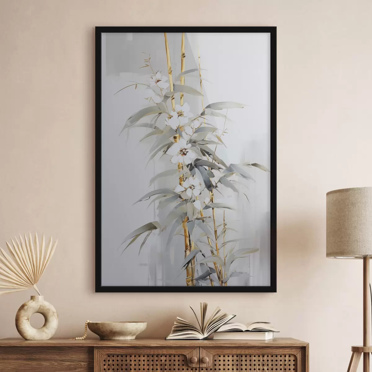 Poster Abstrakte Bambusstämme mit gelben Akzenten, zarten weißen Blüten und hellgrünen Blättern, grauer Hintergrund Nr f47039