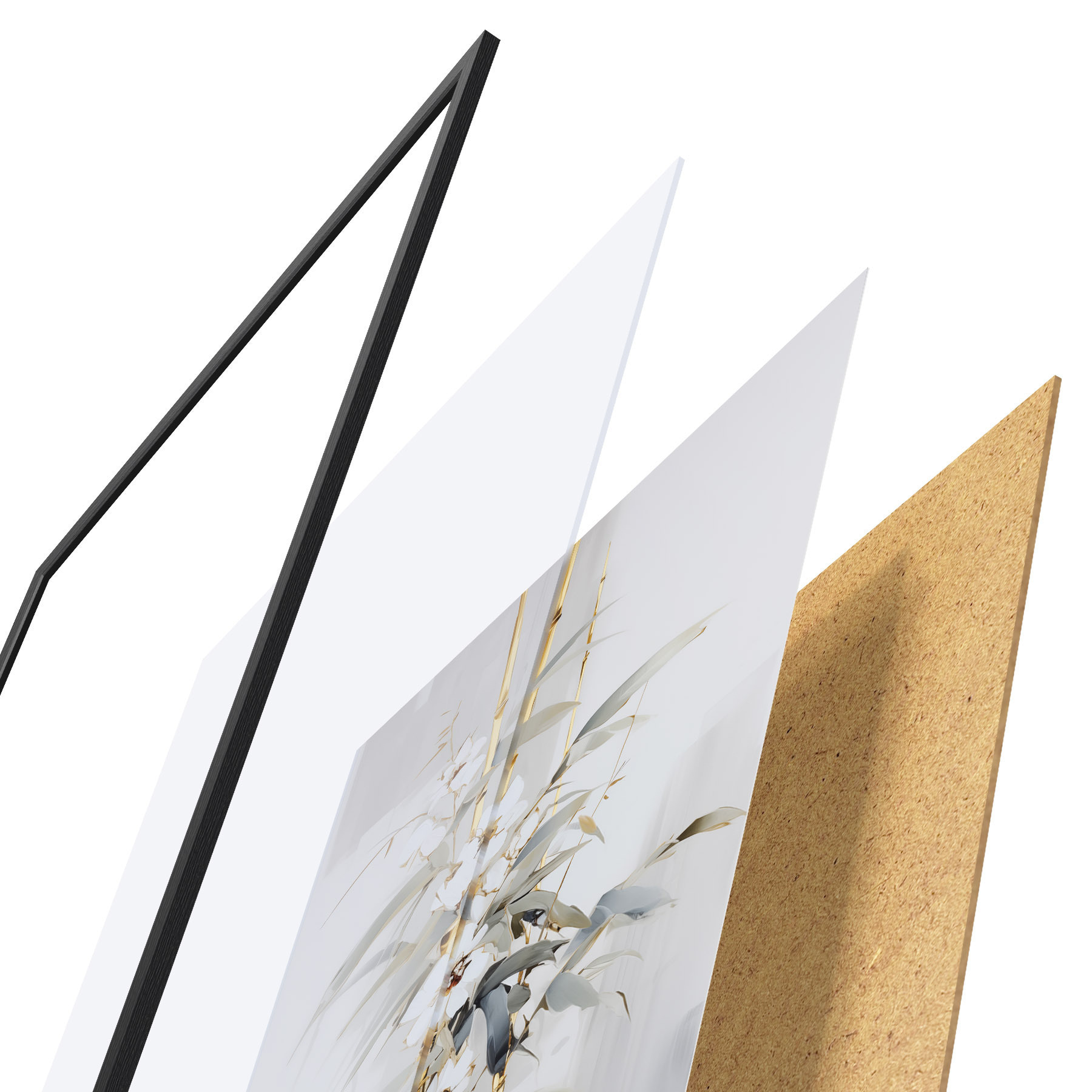 Das Poster besteht aus einem Rahmen, Plexiglas, einem gedruckten Bild und einer Rückwand aus Spanplatten. Dank der Halterungen auf der Rückseite kann das Poster sofort an die Wand gehängt werden.